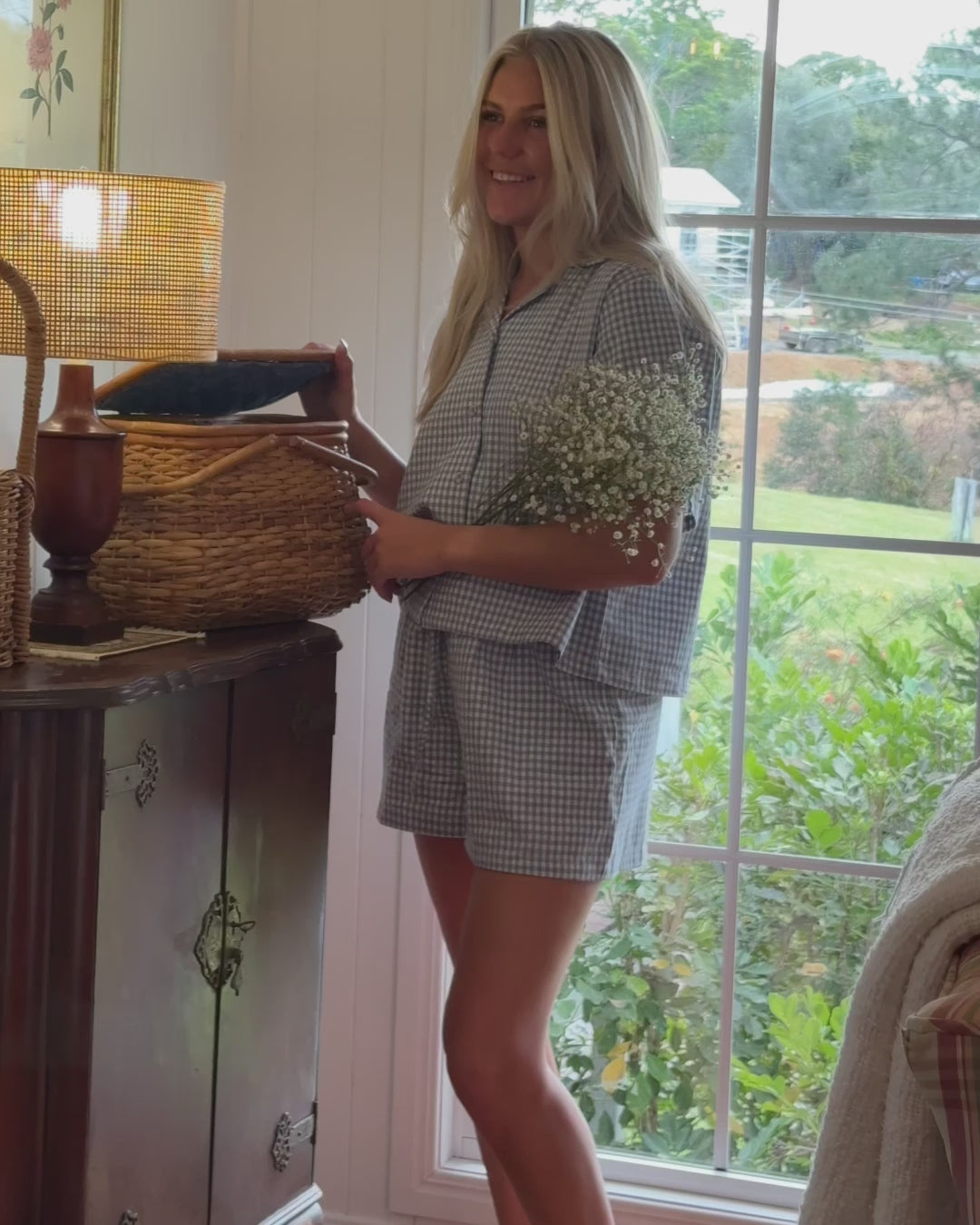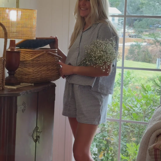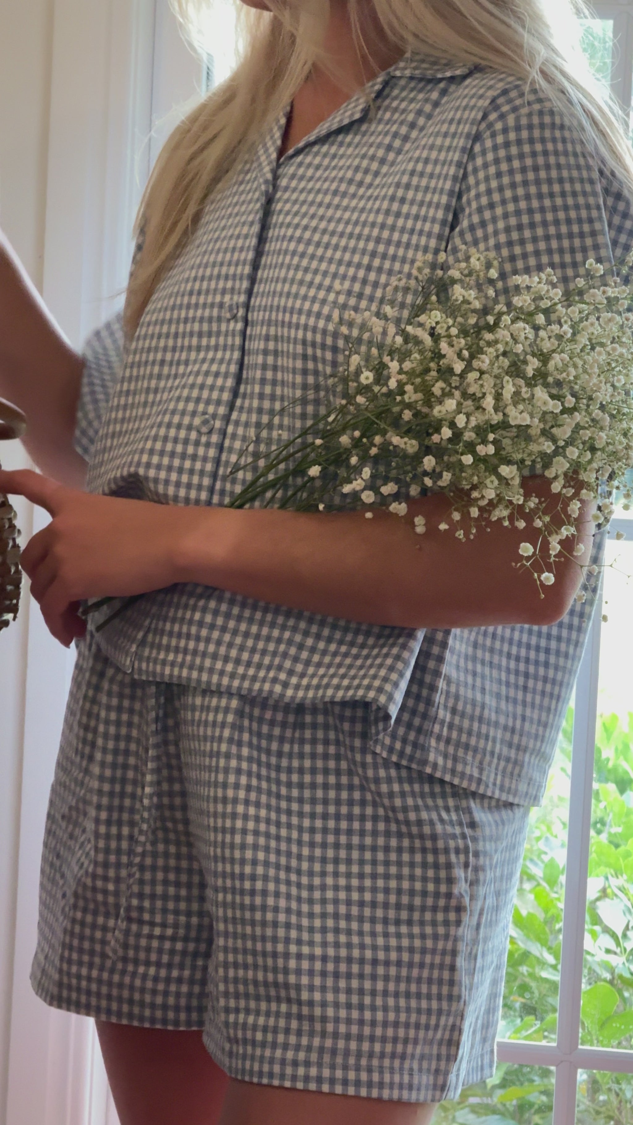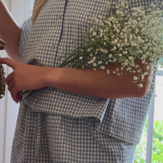 A timeless nod to cottage simplicity, Blue Wren is crafted from a soft blend of 85% cotton and 15% linen, offering both breathability and a gentle drape. Featuring a relaxed button-up shirt and matching shorts, its blue gingham brings a fresh, nostalgic charm.