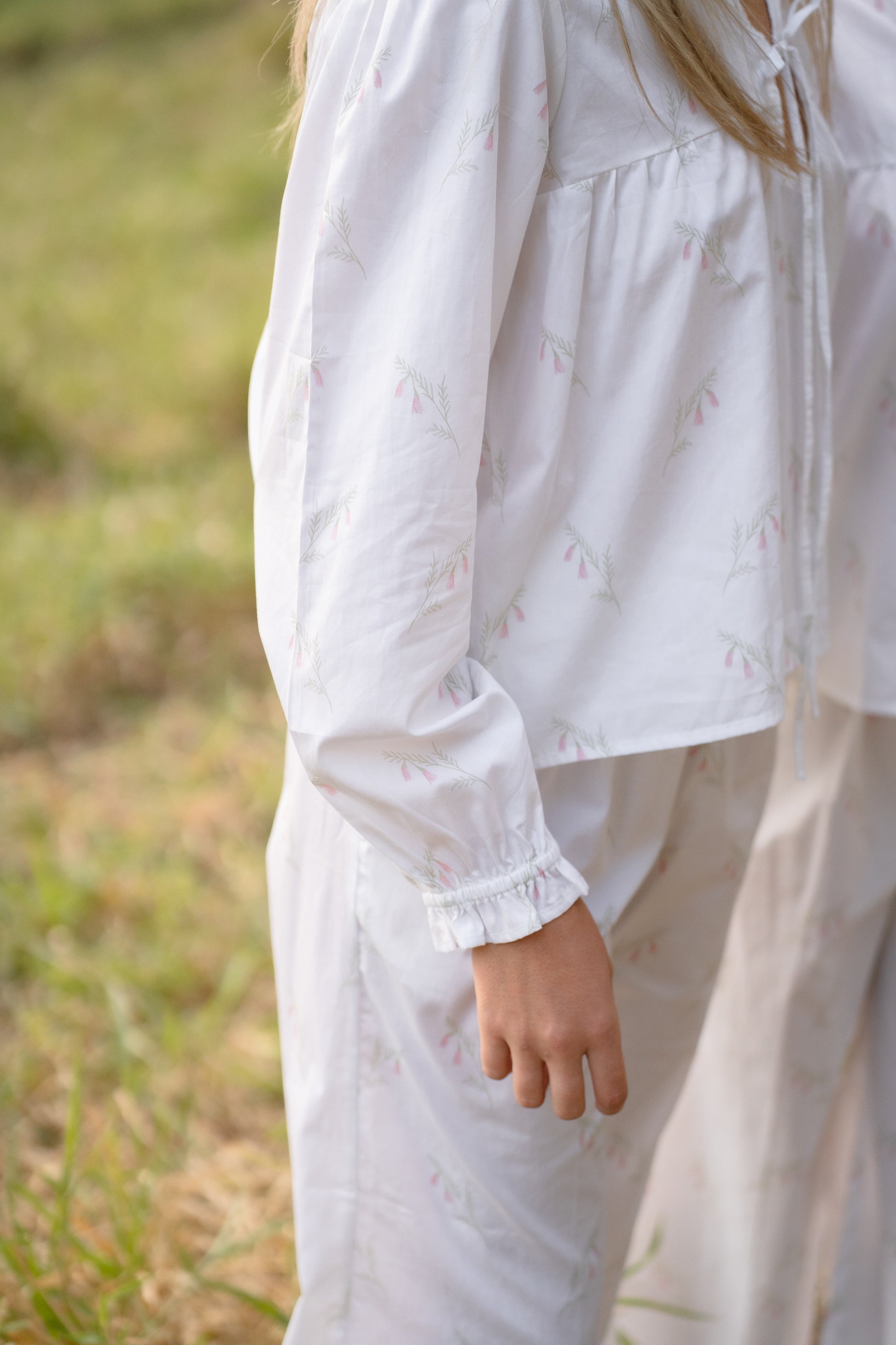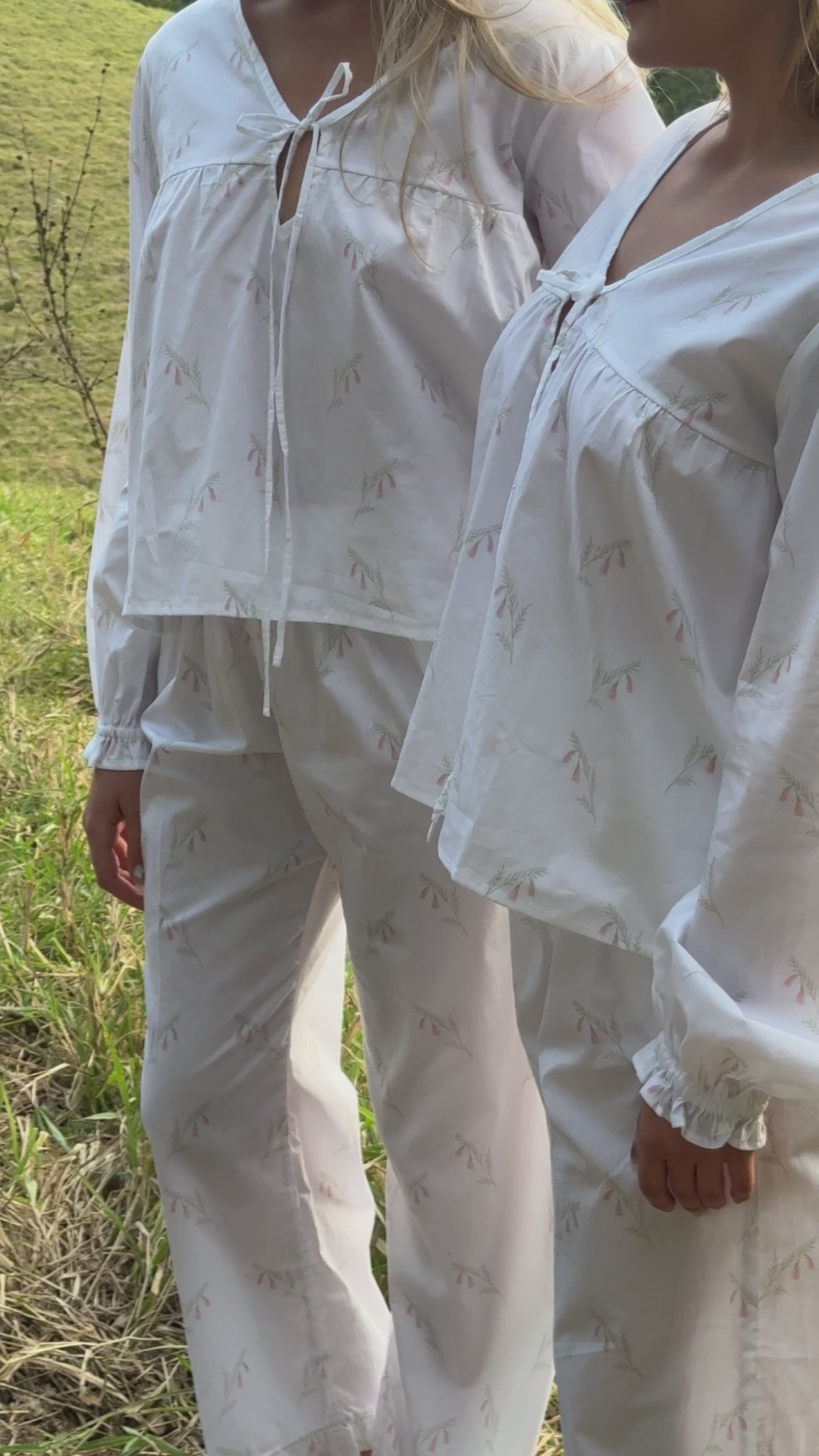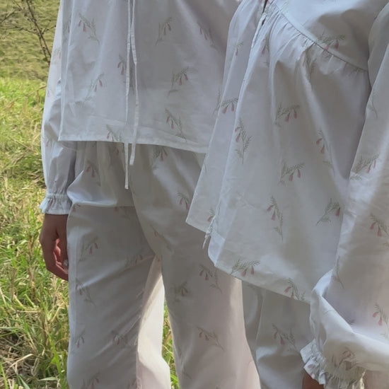 A soft tribute to Australia’s native wildflowers, Heathland Bloom is crafted from 100% cotton and patterned with a delicate Pink Heath print, known for its graceful bell-shaped blossoms. Featuring a loose-fitting blouse and matching full-length trousers with ruffled hems, finished with French seams for a refined, durable touch. It’s a piece that balances comfort and elegance.