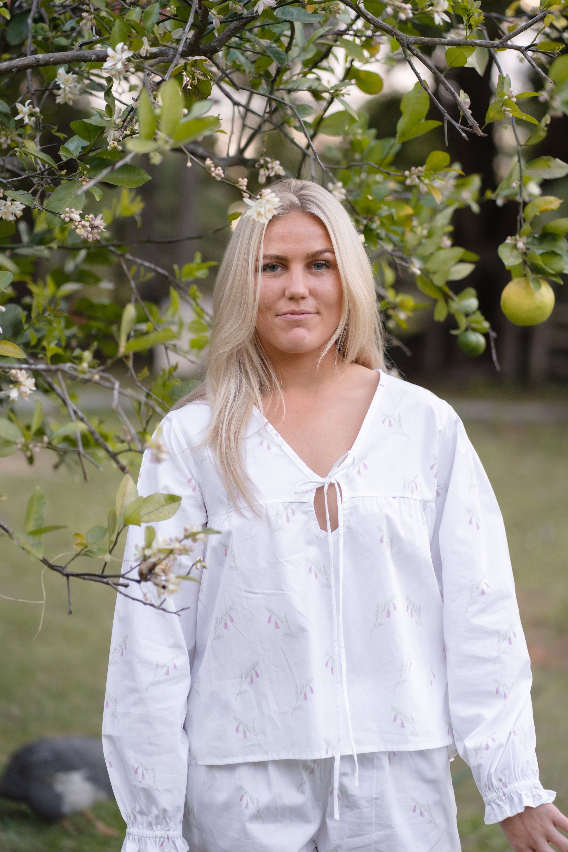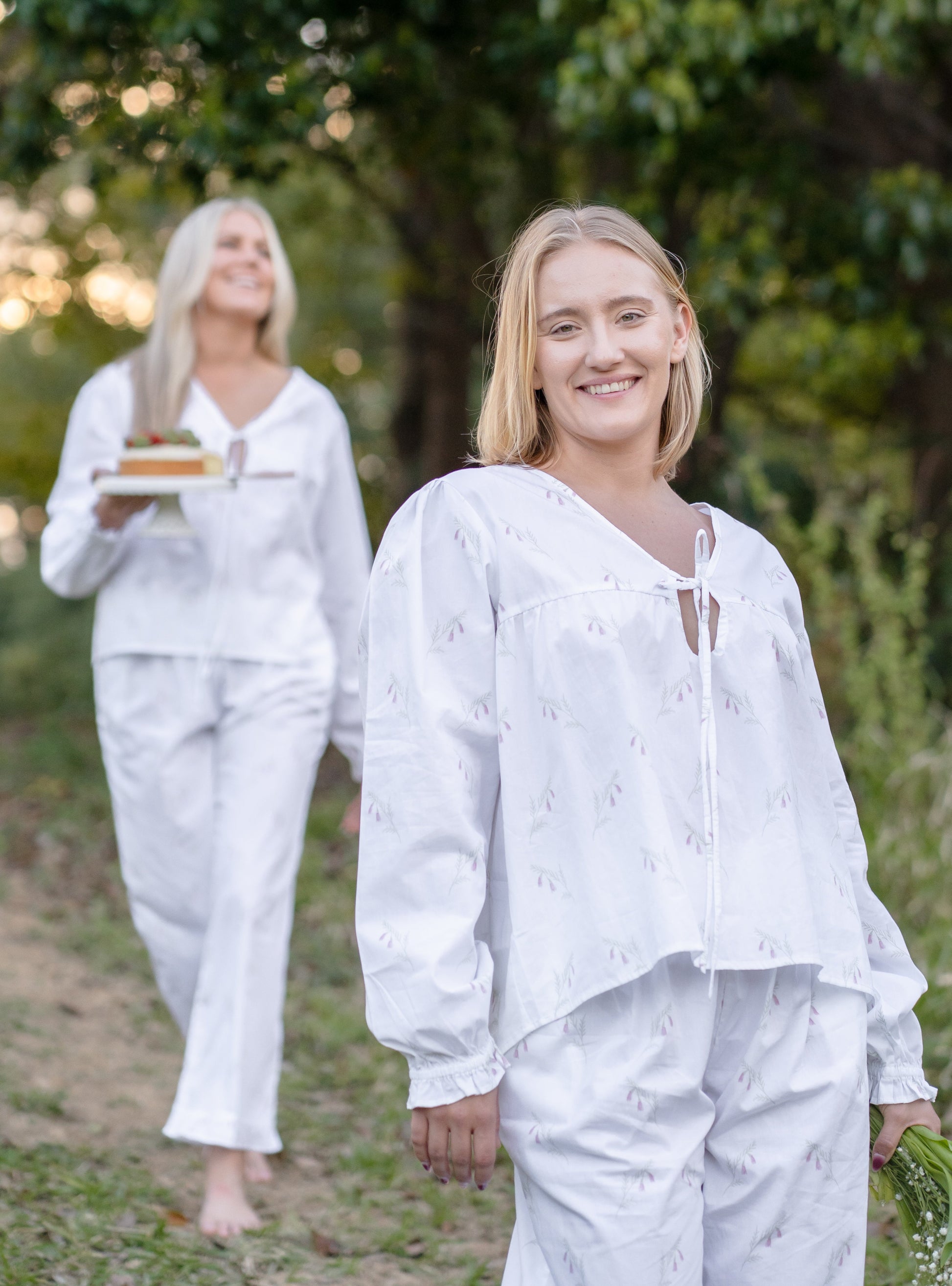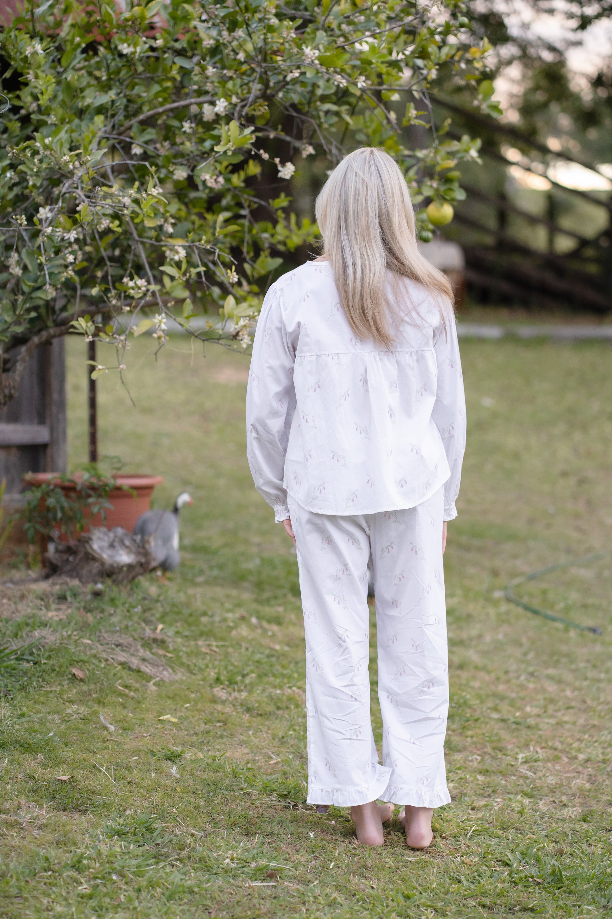 A soft tribute to Australia’s native wildflowers, Heathland Bloom is crafted from 100% cotton and patterned with a delicate Pink Heath print, known for its graceful bell-shaped blossoms. Featuring a loose-fitting blouse and matching full-length trousers with ruffled hems, finished with French seams for a refined, durable touch. It’s a piece that balances comfort and elegance.