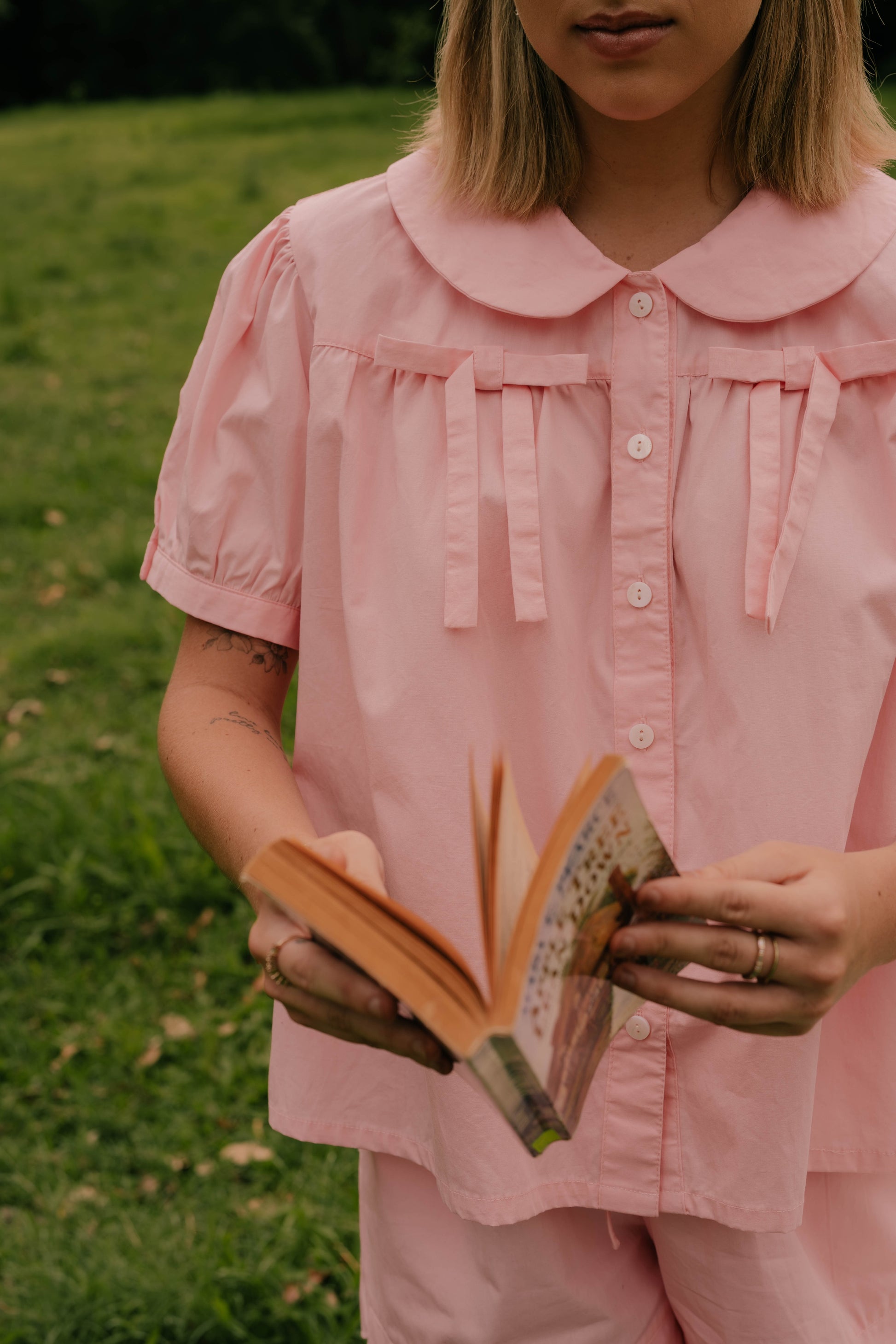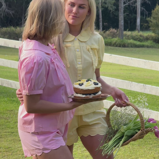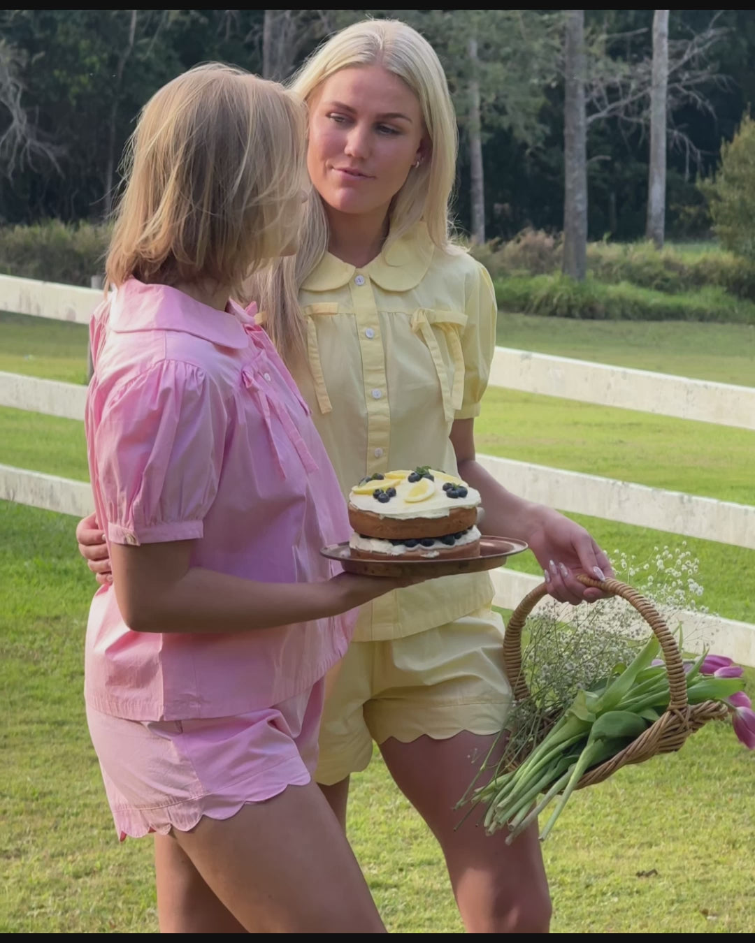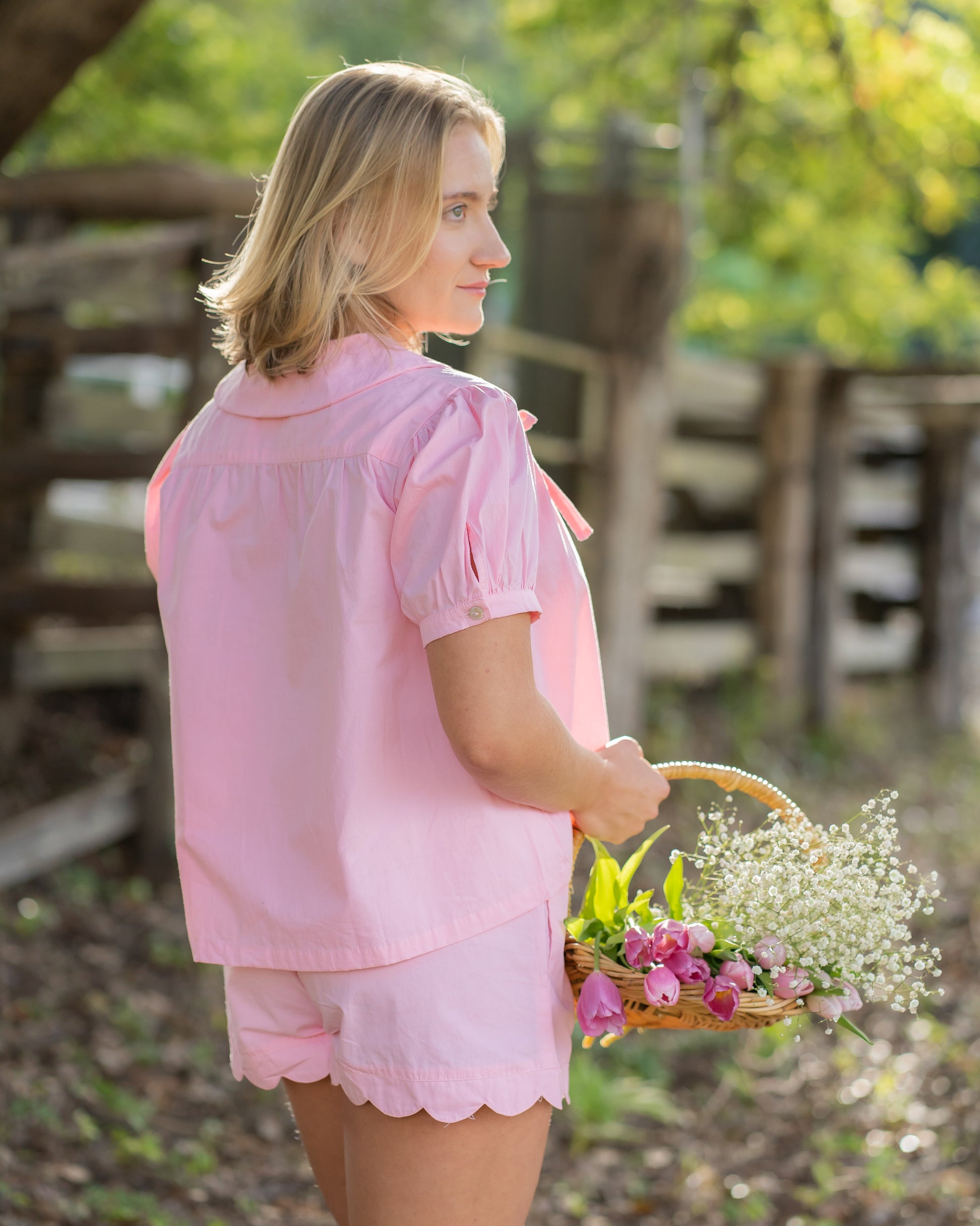 Crafted from 100% cotton, the Rosebud set features delicate scalloped hems and sweet bows that capture the timeless charm of cottage-style living. The airy blouse, with its Peter Pan collar, soft puff sleeves, and matching shorts, offers an effortlessly playful yet comfortable fit.