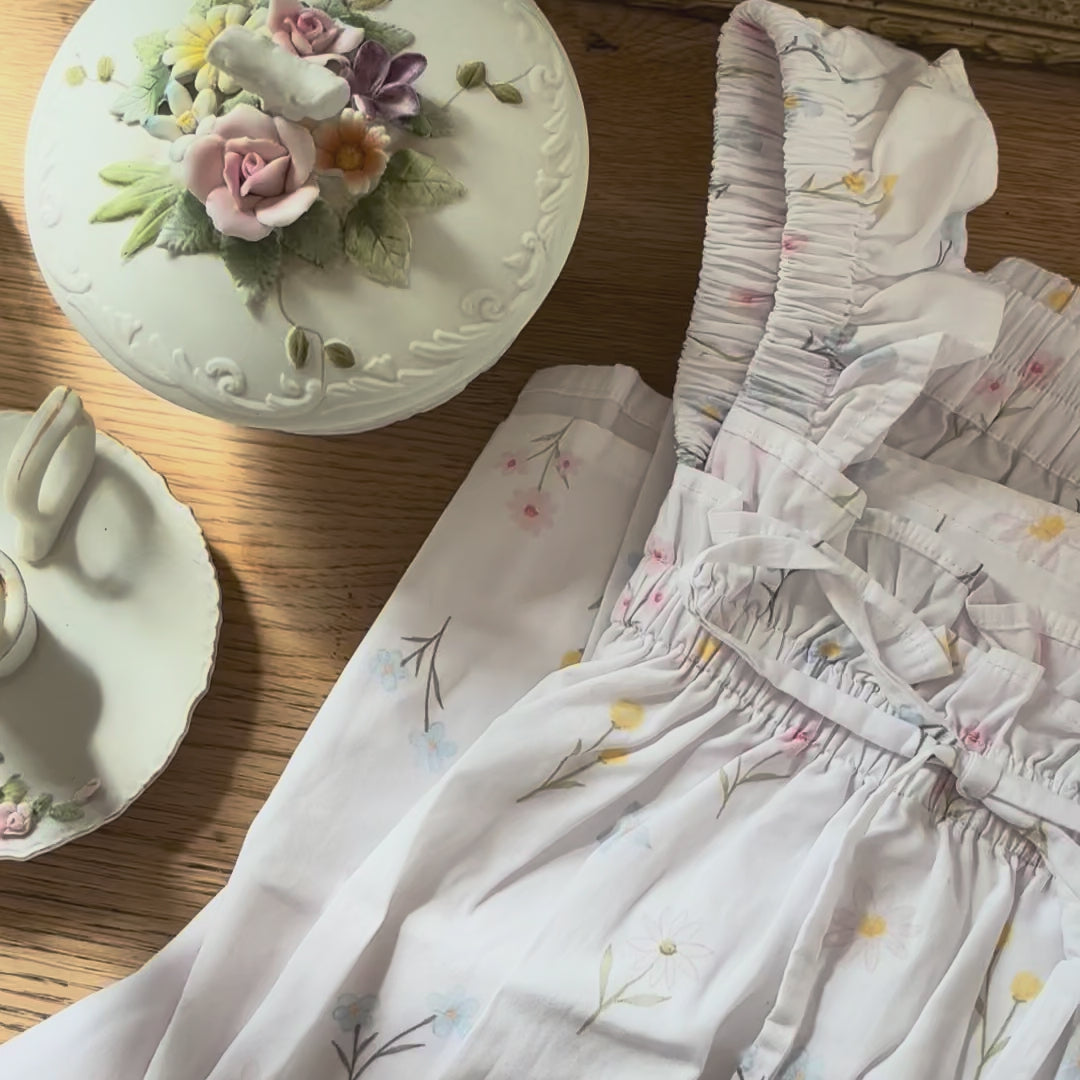 Wildflower Whispers is a lightweight pyjama set made from 100% breathable cotton, with a relaxed, floaty fit, elasticated waist, and delicate ruffle and bow details. She features an exclusive print of Australian native wildflowers, including Billy Buttons, illustrated especially for this set.